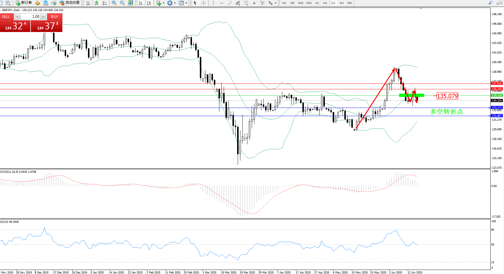 交易策略:135.079下方看跌,目标133.171、131.867
