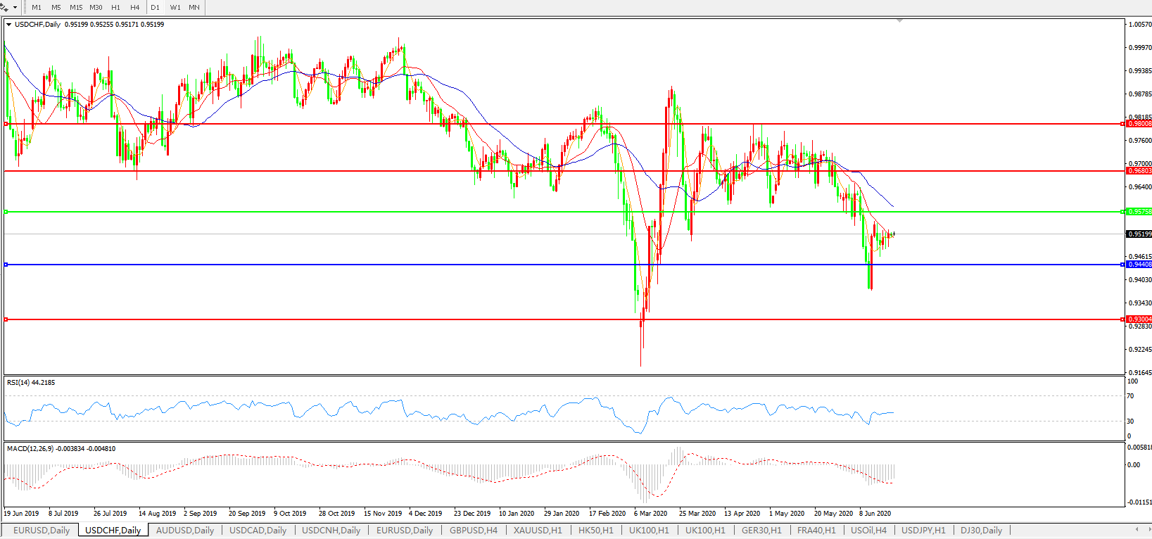 交易策略:0.9575下方看跌,目标0.9440、0.9300