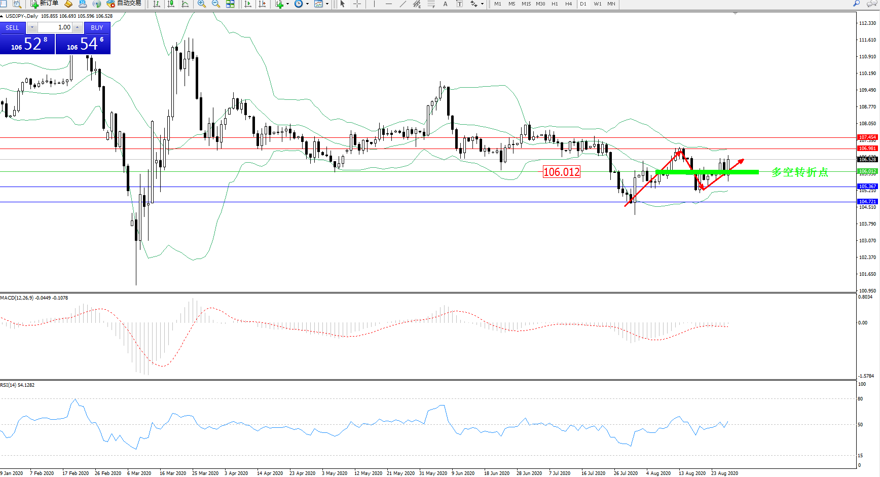 交易策略:106.012上方看涨,目标106.981、107.454