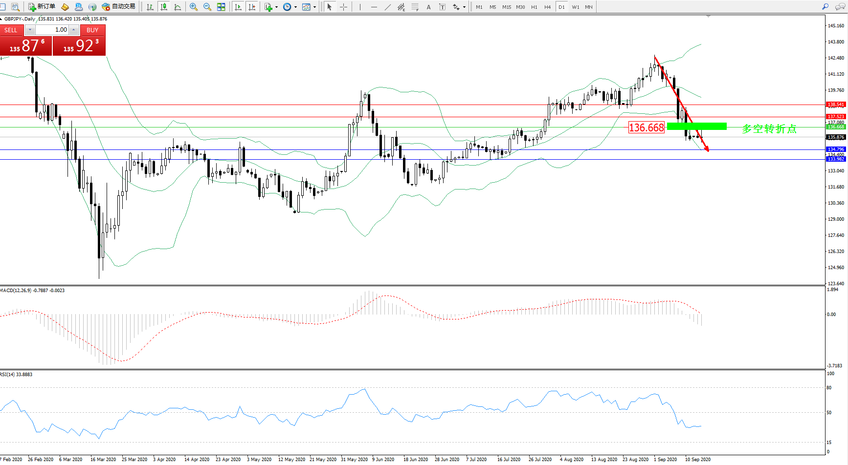 交易策略:136.668下方看跌,目标134.796、133.982