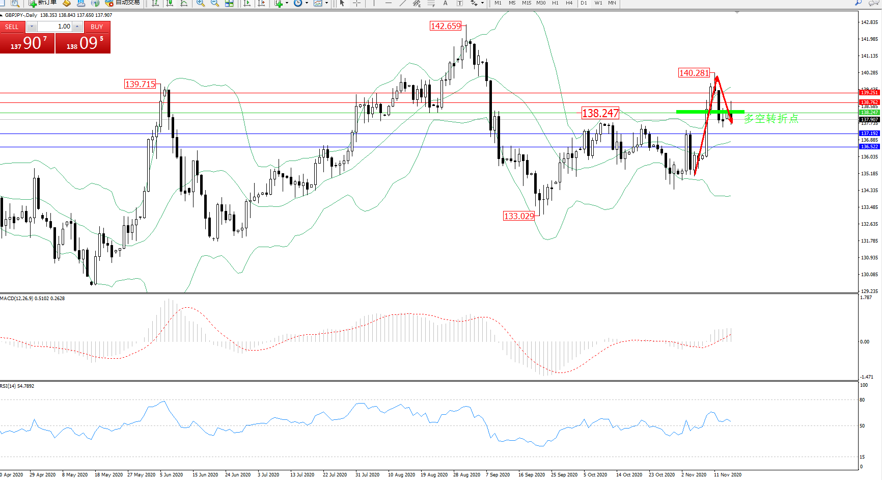 技术点评:多头动力延续布林带指标上轨附近强势拉升上扬后出现反转下移,高位抵达140.281附近后遇阻开始快速回撤,多头拉升动力结束,空头下行动力入场,布林带指标呈张口走势后有收口迹象,MACD指标低位多头多空持续震荡上扬至0轴线上方多头区域维持震荡,RSI指标处于50均衡线上方多头区域震荡后开始缓慢下行中;
