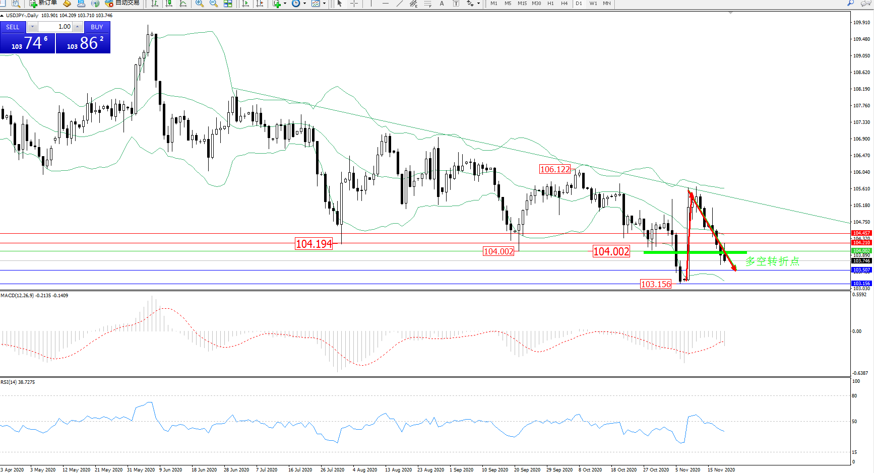 交易策略:104.002下方看跌,目标103.507、103.156