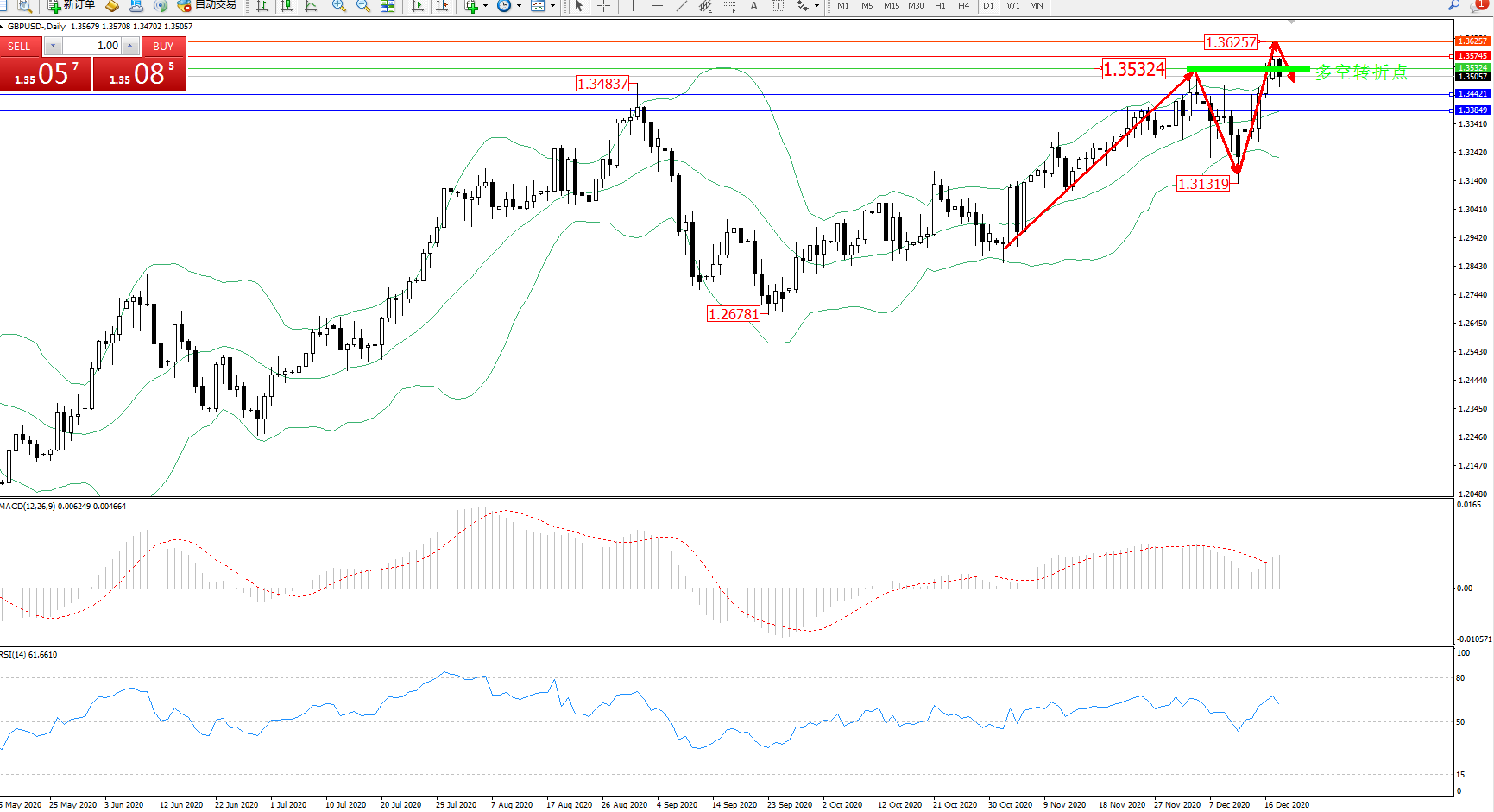 备选策略:1.35324上方看涨,目标1.35745、1.36257