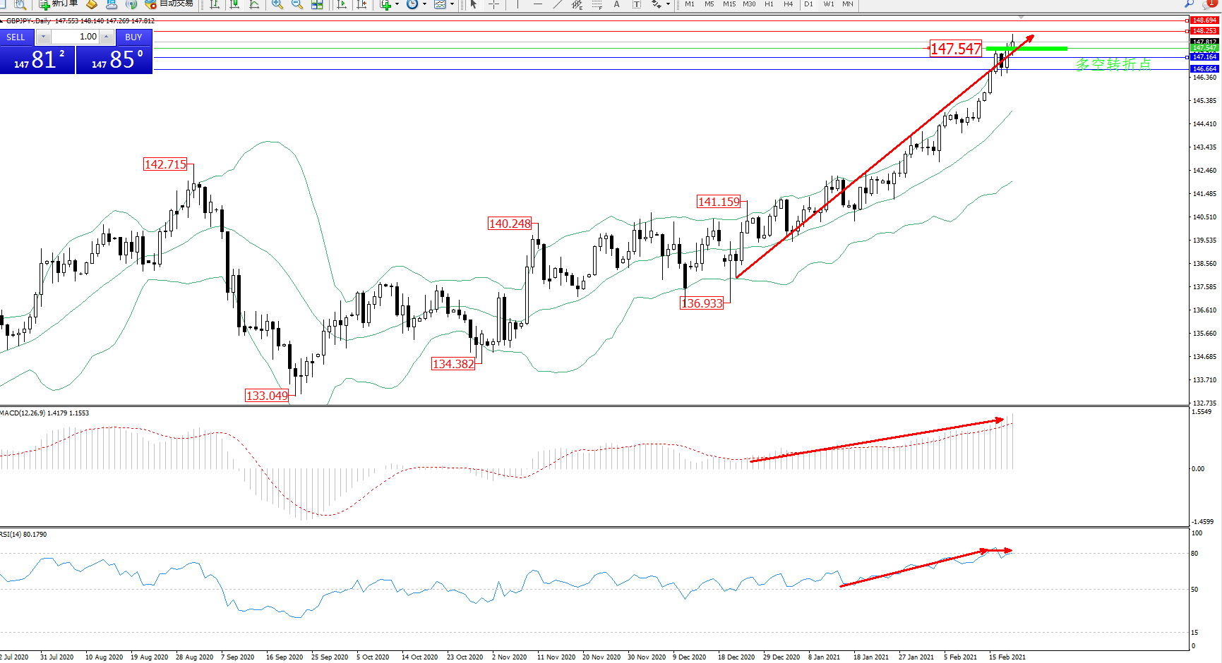 英镑兑日圆上行至147.812附近震荡中,英国2月GfK消费者信心创近一年前疫情爆发以来最高,得益于对英国快速的疫苗接种计划将提振经济的希望。疫苗接种在最高危的老年人口中已经得到了充分覆盖,住院治疗人数大幅下降,从而可以实现有序重新开放经济。反过来,更乐观的经济前景使市场打消了对英国央行实施负利率政策的预期,英国经济将在明年初恢复到危机前的规模,比多数经济学家预期的要早,但失业率要恢复到危机前的水平,还需要多年时间。 如果英国在这方面继续领先于美国和欧元区,则对复苏势头的预期可能会继续增强。潜在的下行风险来自,一旦出现有任何证明对现有疫苗都具有抵抗力的变异毒株,因为这可能会使英国在免疫接种方面取得的许多进展宣告无效。