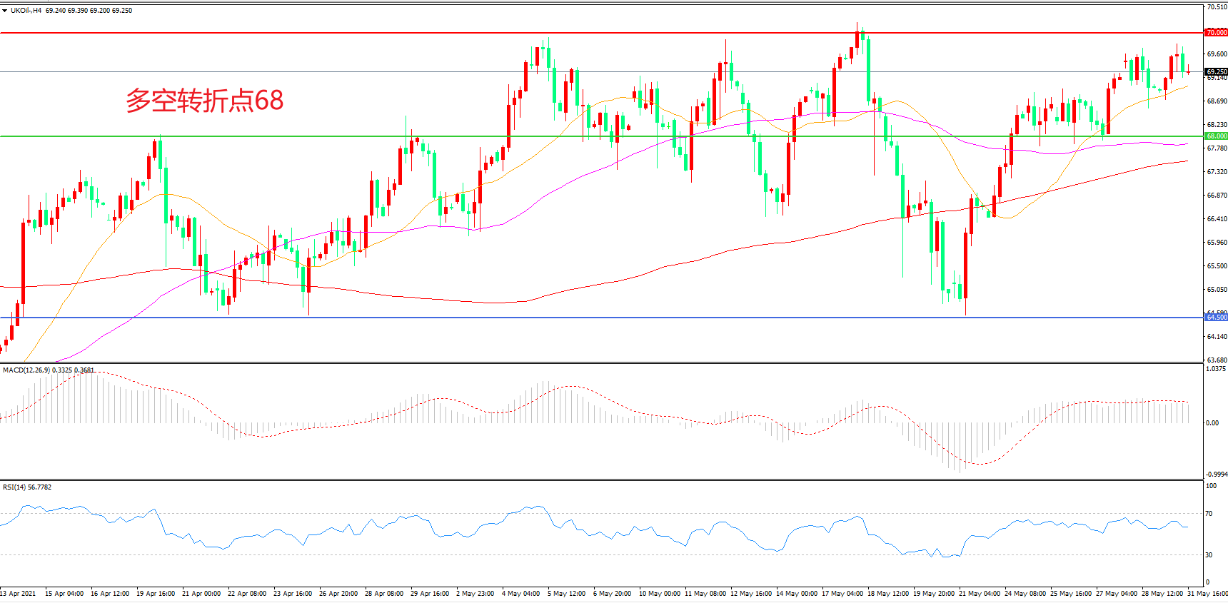 4小时图看,油价长阳拉升,突破前期整理区间,短期表现较为强势,21周期均线成为下方支撑,70美元成为中期阻力,MACD红柱增加,RSI指标走平,日内震荡上行概率较大。