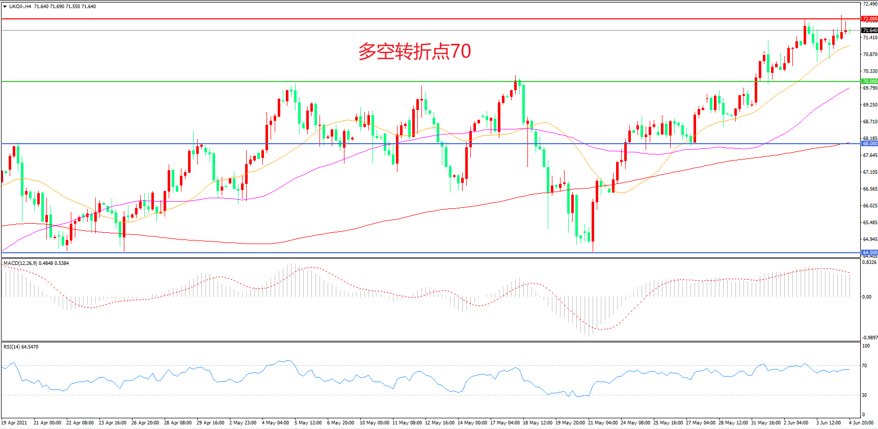 4小时图看,油价震荡上行,多头趋势十分明显,短期表现较为强势,70美元成为下方支撑,72美元成为中期阻力,MACD红柱增加,RSI指标走平,日内震荡上行概率较大。