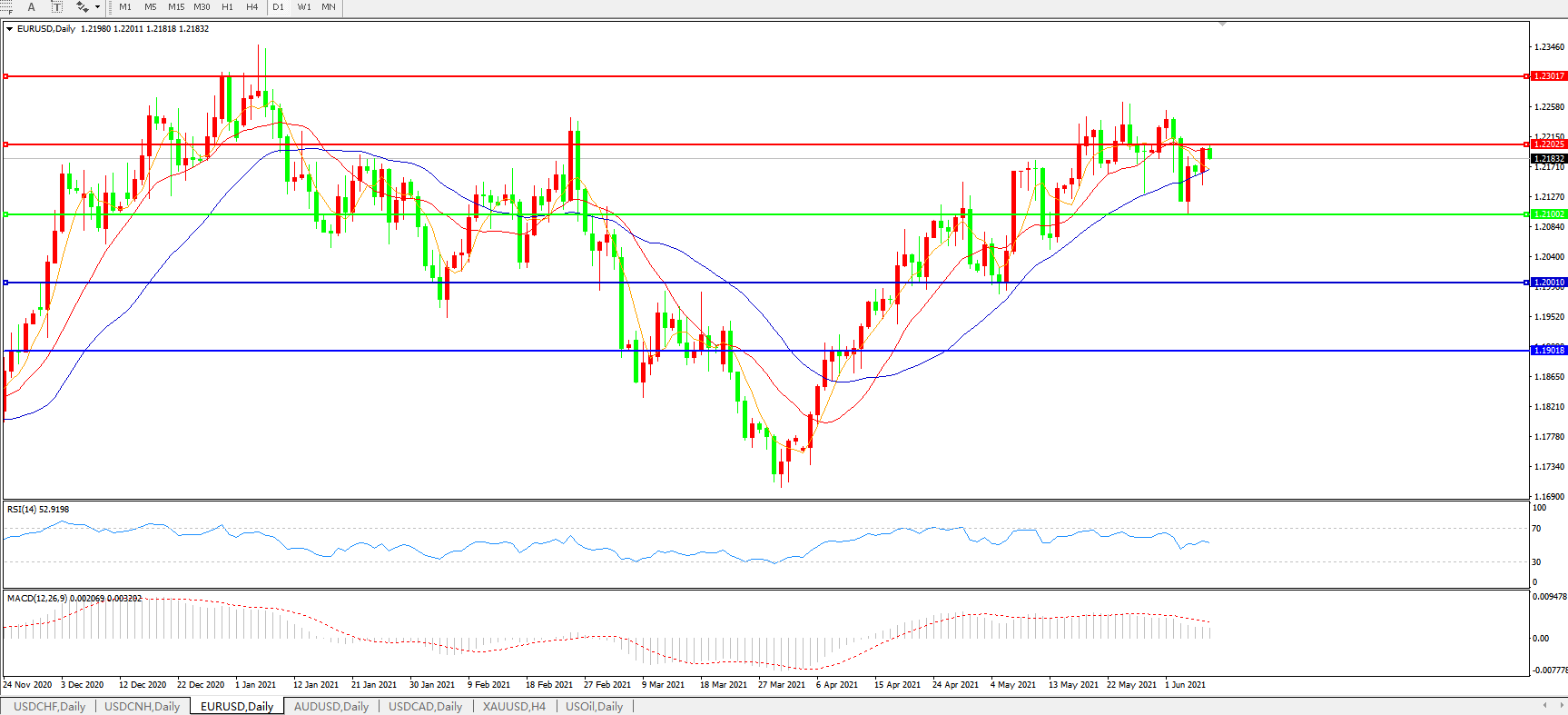 技术面简析:日图均线开始下行,汇价延续偏强整理态势,MACD运行于0轴上但量能开始快速缩量,RSI走弱,预计短期汇价大概率将进一步上。