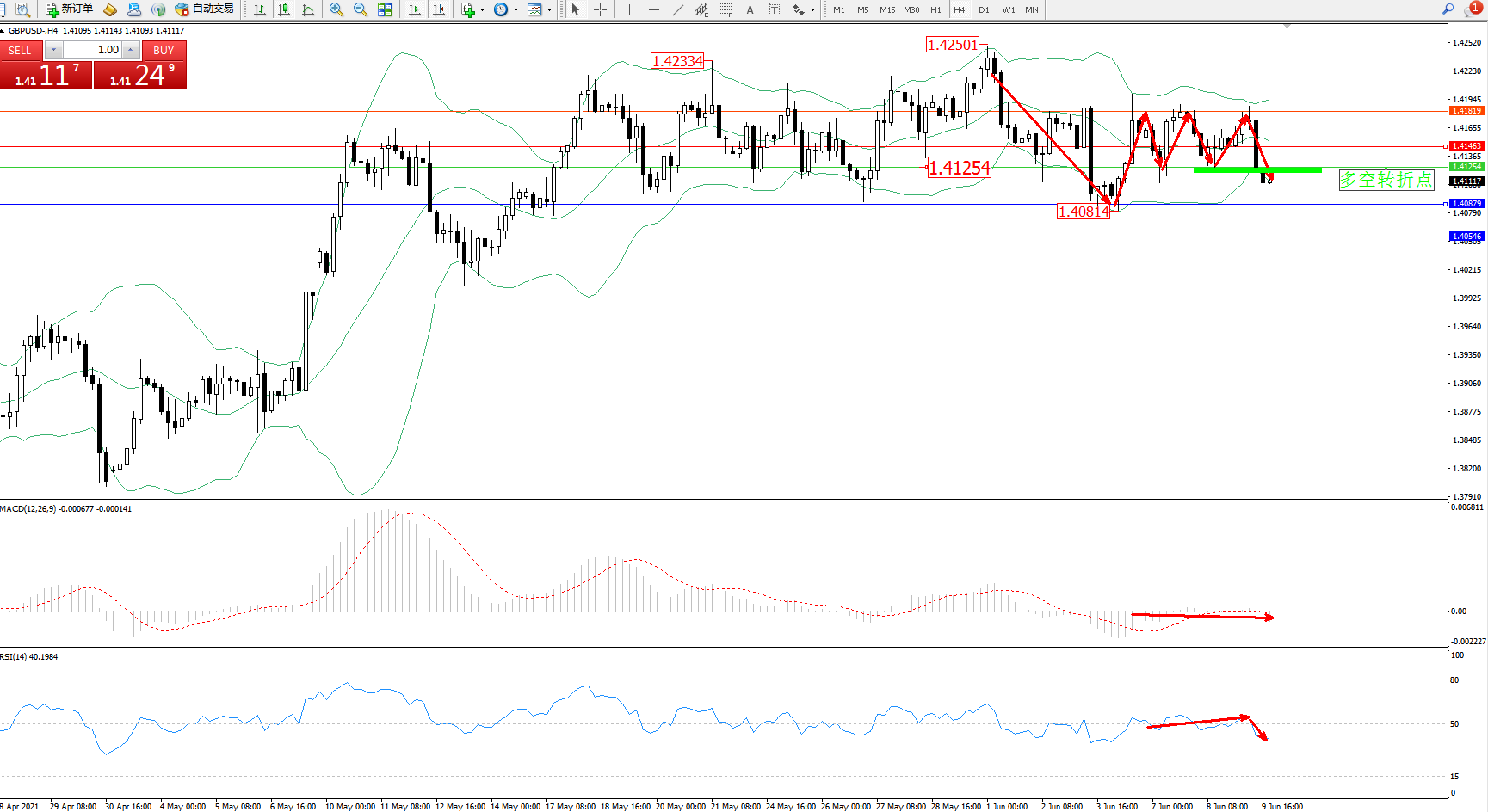 交易策略:1.41254下方看跌,目标1.40879、1.40546