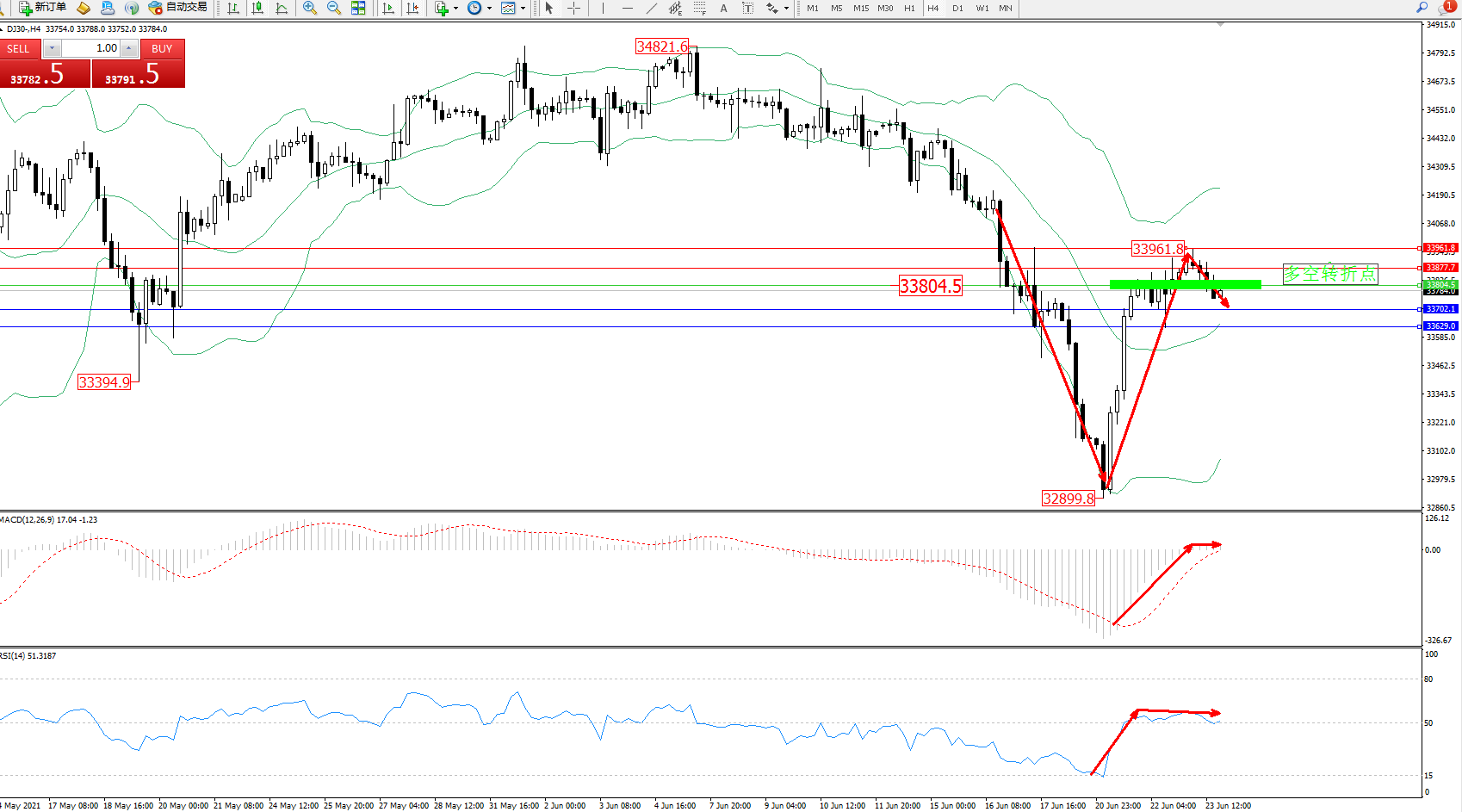 交易策略:33804下方看跌,目标33702、33629