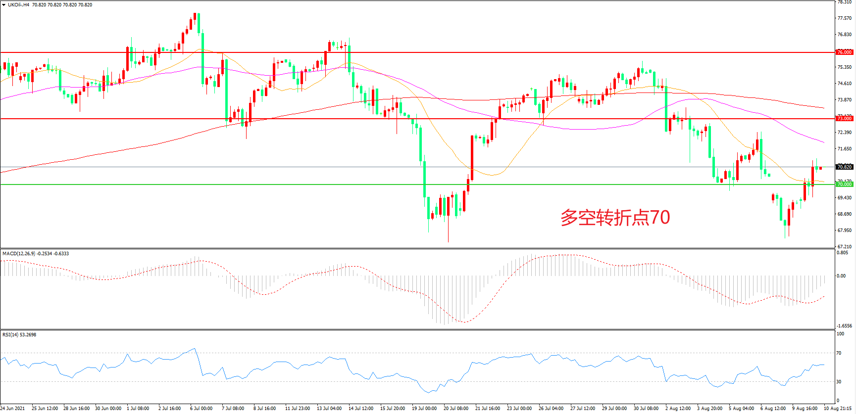 4小时图看,油价跳空低开后震荡反弹,70美元成为短期多空分水岭,均线系统逐渐走平,MACD绿柱缩短,油价震荡上行概率较大。