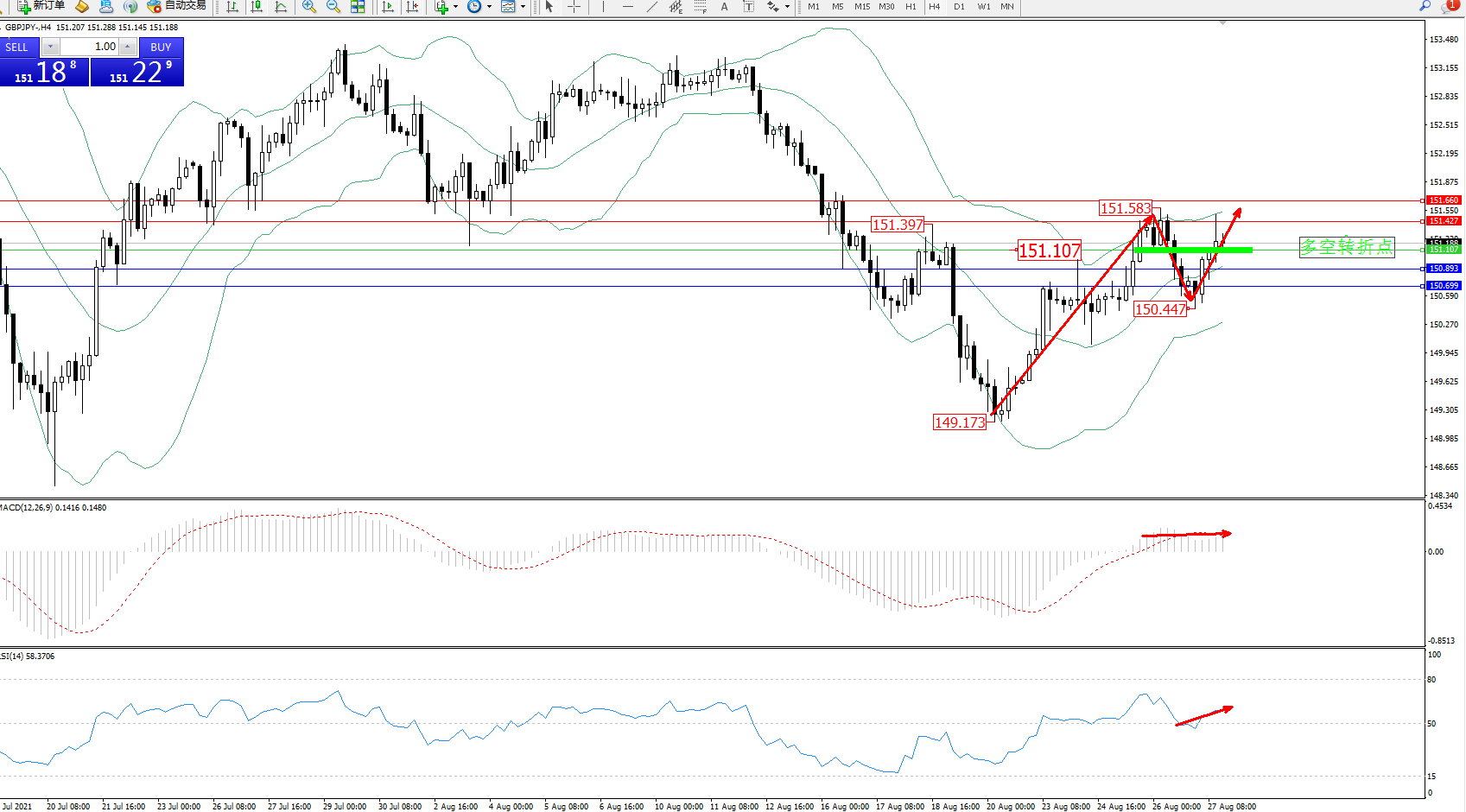 交易策略:151.107上方看涨,目标151.427、151.660