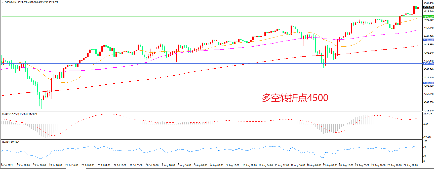 周一(8月30日),美联储主席鲍威尔透露今年加息尚远的鸽派信号后,标普500在科技股的支撑下延续涨势,收报4530.75点。最新的通胀数据为鲍威尔的鸽派观点提供了支持,因此美联储将等待就业市场的更多表现,才能决定何时以何种速度开始收紧资产购买作出决定,本周市场将迎来ADP就业数据与非农就业数据,市场波动可能会十分剧烈。