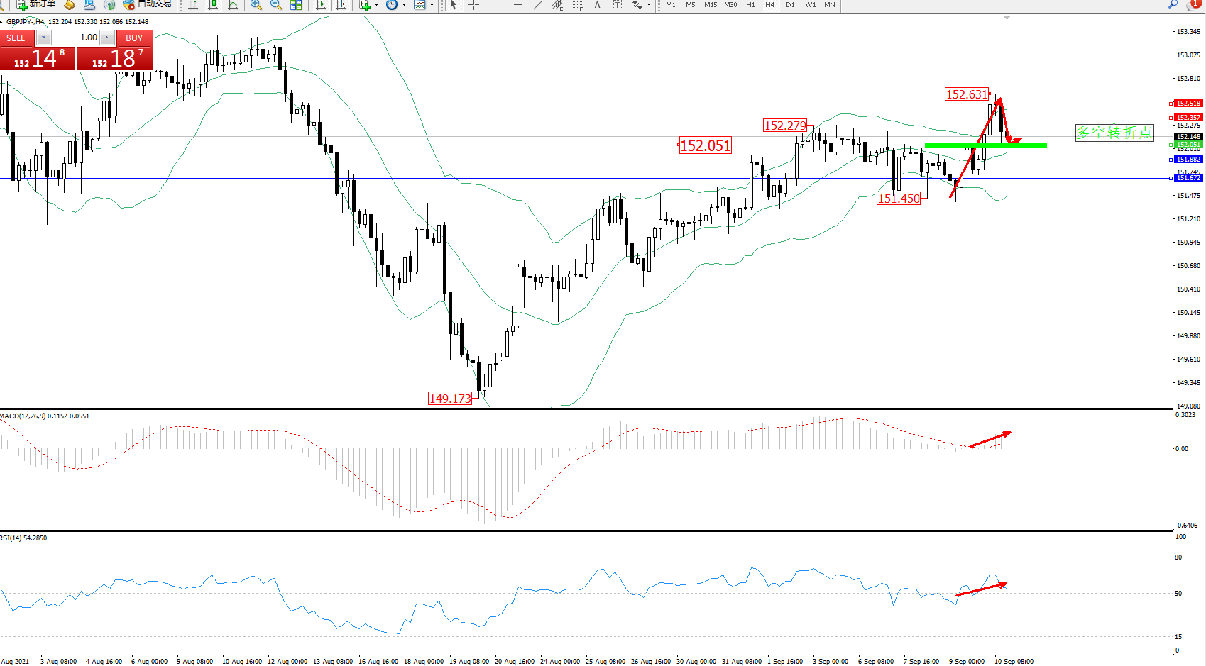 备选策略:152.051下方看跌,目标151.882、151.672