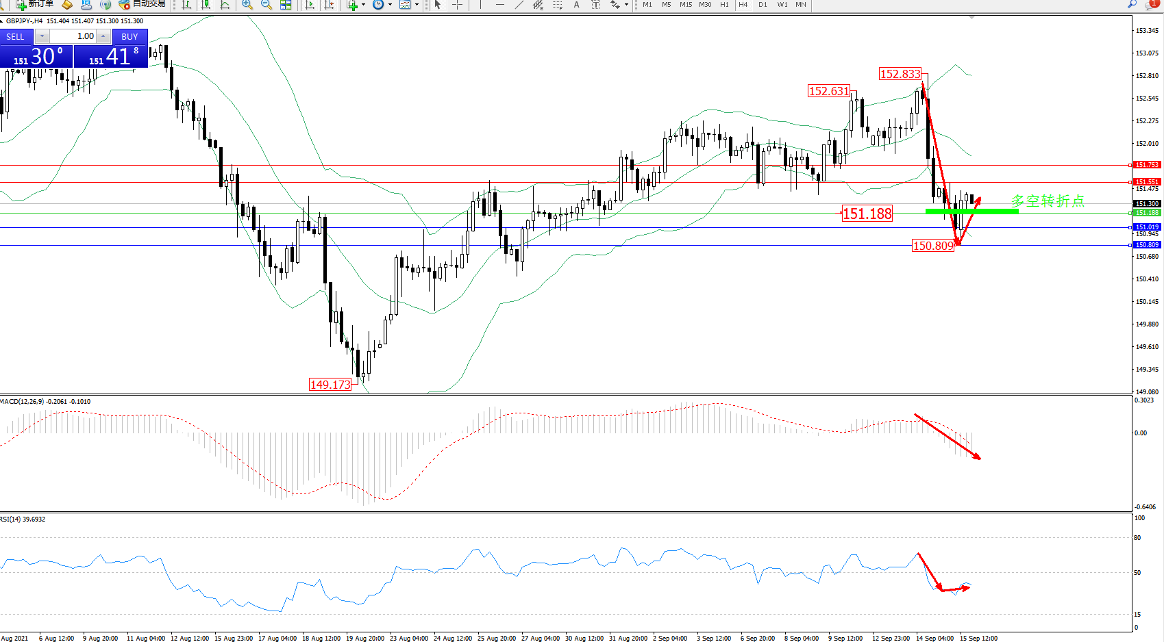 备选策略:151.188下方看跌,目标151.019、150.809