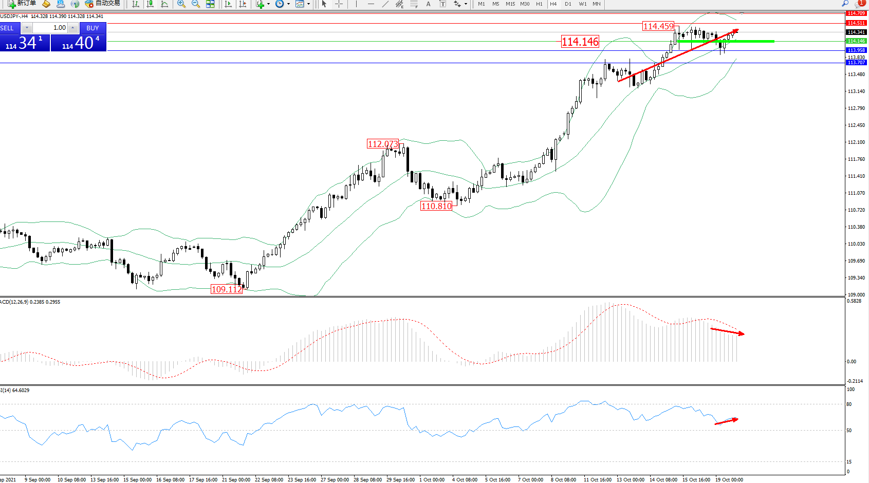 技术点评:多头动力延续布林带指标通道中上轨区间持续震荡上扬,高位抵达114.459位置后开始维持窄幅整理,但多头上扬态势良好,且未有最终止步迹象,布林带指标高位开始缓慢收口走势中,MACD指标处于多头区域维持整理平移,RSI指标处于多头区域维持弱势徘徊中;