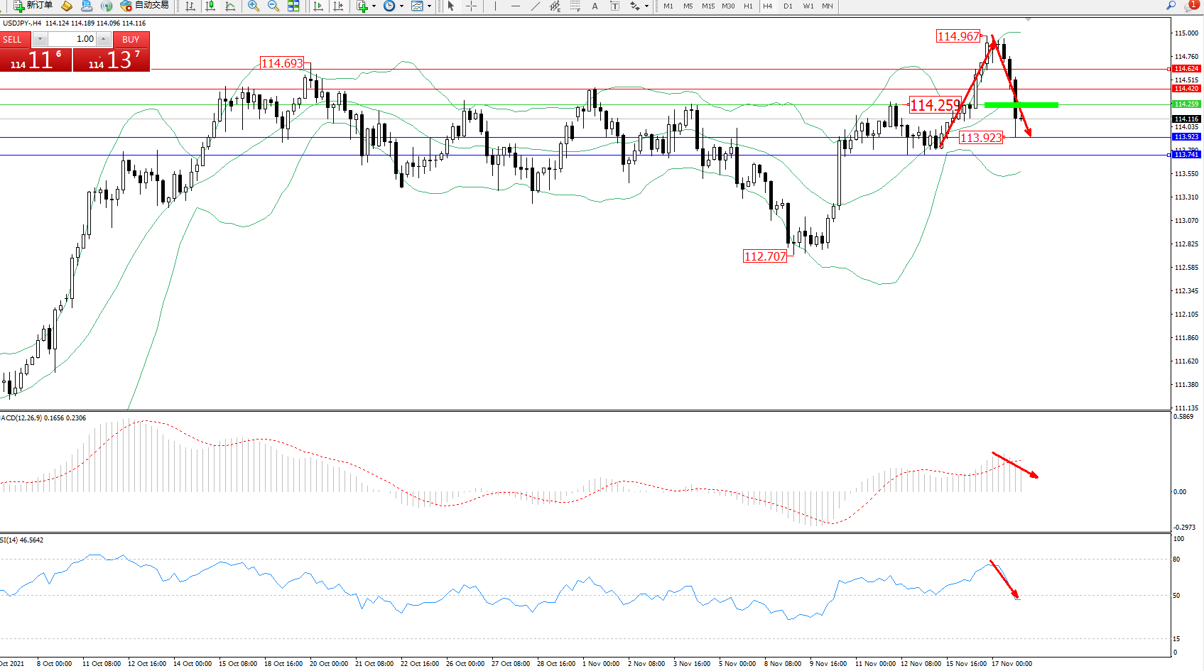 交易策略:114.259下方看跌,目标113.923、113.741