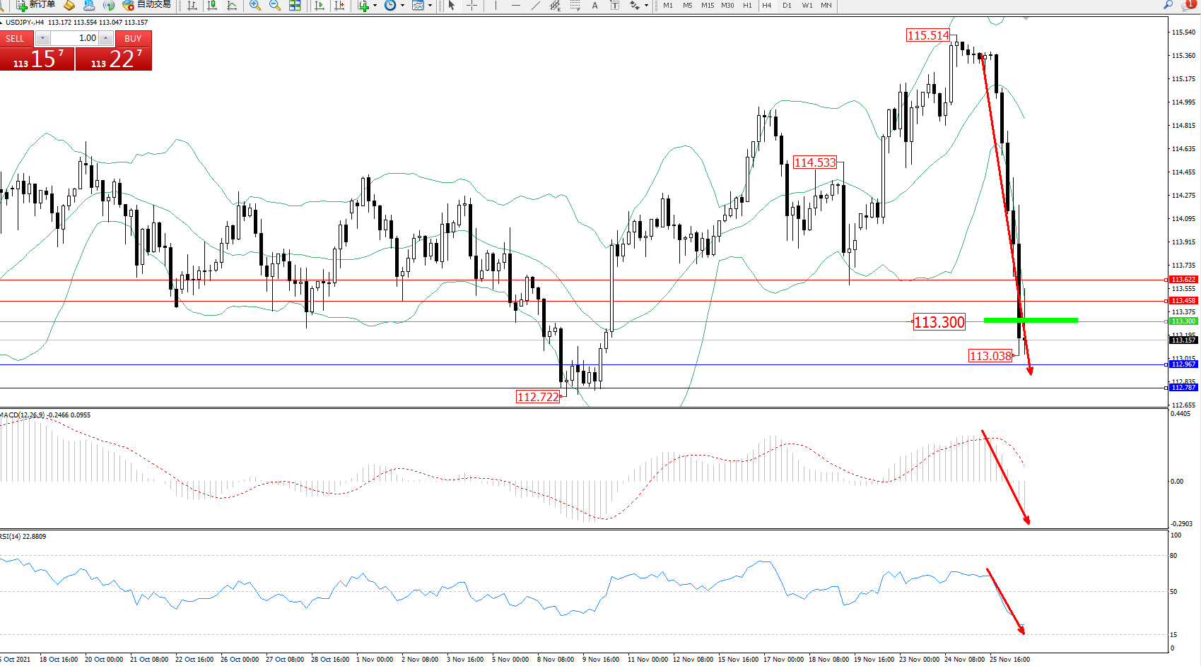 交易策略:113.300下方看跌,目标112.967、112.787