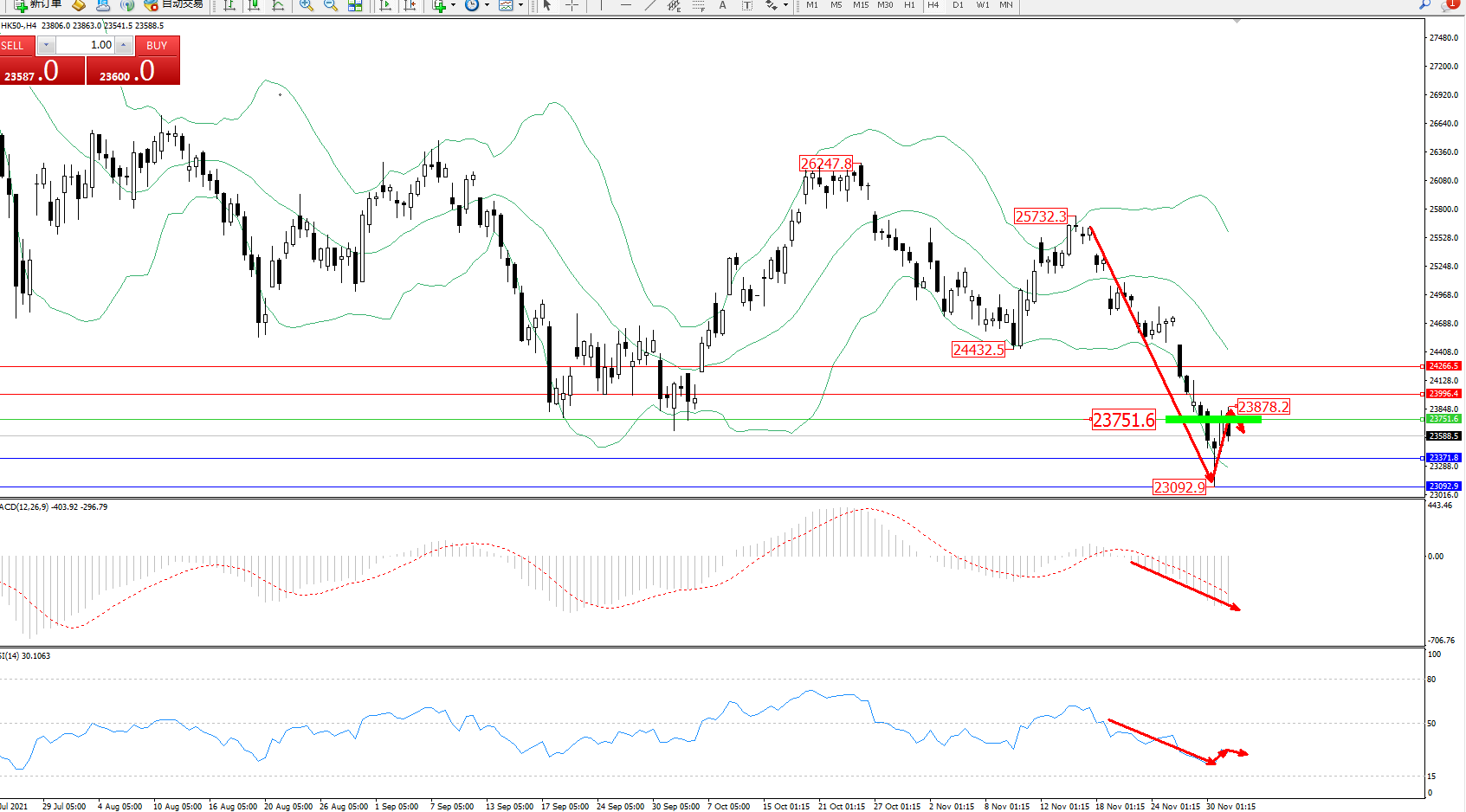 技术点评:空头动力延续布林带指标下轨附近持续下探,低位抵达23092位置得到短暂支撑反转上移,短期多头动力有上移迹象,但整体走势依旧处于布林带指标通道中下轨区间持续下行,布林带指标呈张口走势后开始收口下行,MACD指标处于空头区域维持整理下行,RSI指标处于空头区域持续震荡下行后开始徘徊;
