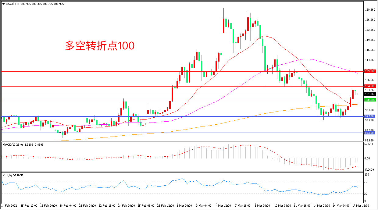 周四(3月17日),俄罗斯总统新闻秘书称,俄乌代表团谈判工作仍在继续,有关乌克兰谈判取得重大进展的报道“错误”, 美国WTI原油涨逾8%,收报101.96美元/桶。IEA公布的月报中显示,从4月起,石油市场每天可能损失300万桶俄罗斯原油和成品油,这一降幅超过了需求预期下降100万桶/日的幅度,供应偏紧将使原油价格仍将维持在高位。