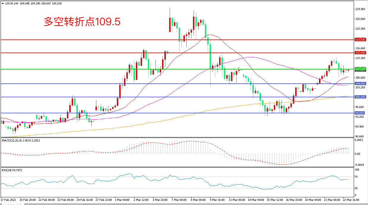 周二(3月22日),俄乌局势有所缓解,德国带头反对欧盟可能对俄罗斯石油实施的禁运制裁,原油断供担忧缓解,美国WTI原油小幅回落,收报109.06美元/桶。目前投资者仍爱权衡市场供应紧张之际失去俄罗斯石油供应的影响,二季度若谈判顺利,地缘溢价有望继续回落,否则油价维持高位概率较大。