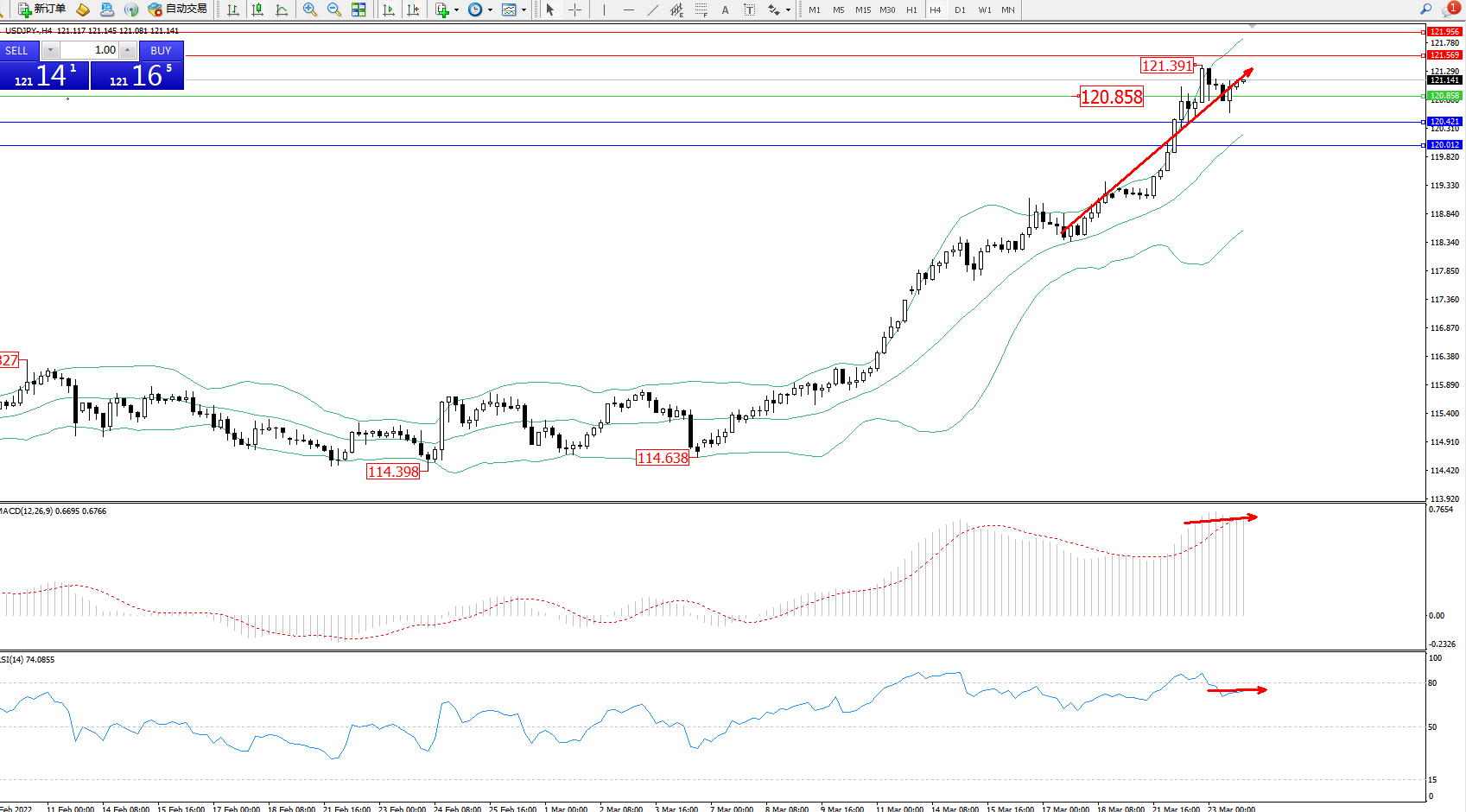 技术点评:多头动力延续布林带指标通道上轨附近持续震荡上扬,高位抵达121.391位置节点后开始整理平移,短期多头动力依旧有进一步上移迹象,布林带指标呈上行趋势走势持续中,MACD指标处于多头区域高位维持整理平移,RSI指标处于多头区域维持弱势徘徊后回撤至超买区80均衡线下侧整理;