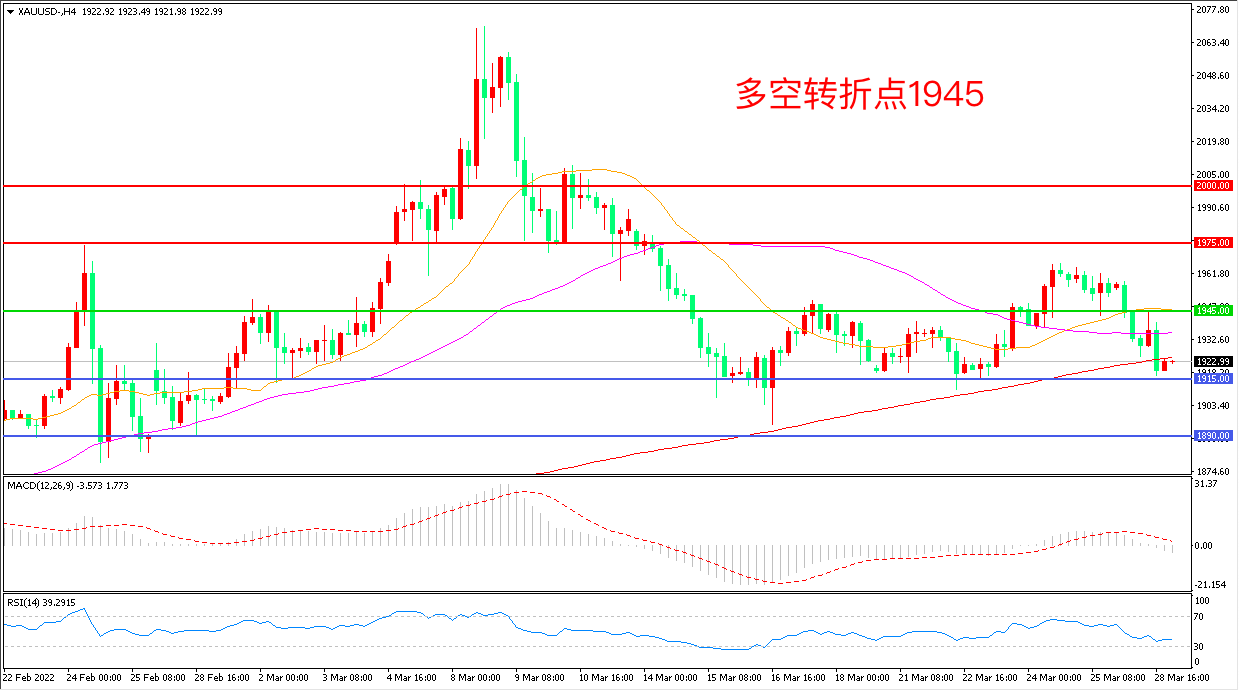 周一(3月29日),美国短债在美联储激进的加息预期下遭到猛烈抛售,国债收益率飙升带动美元大幅上涨,现货黄金破位下行,收报1922.04美元/盎司。近期美联储出乎市场意料地采取鹰派政策的风险不断上升,这可能进一步削弱一批黄金买家的的兴趣,重点关注本周公布的ADP与非农就业数据表现。