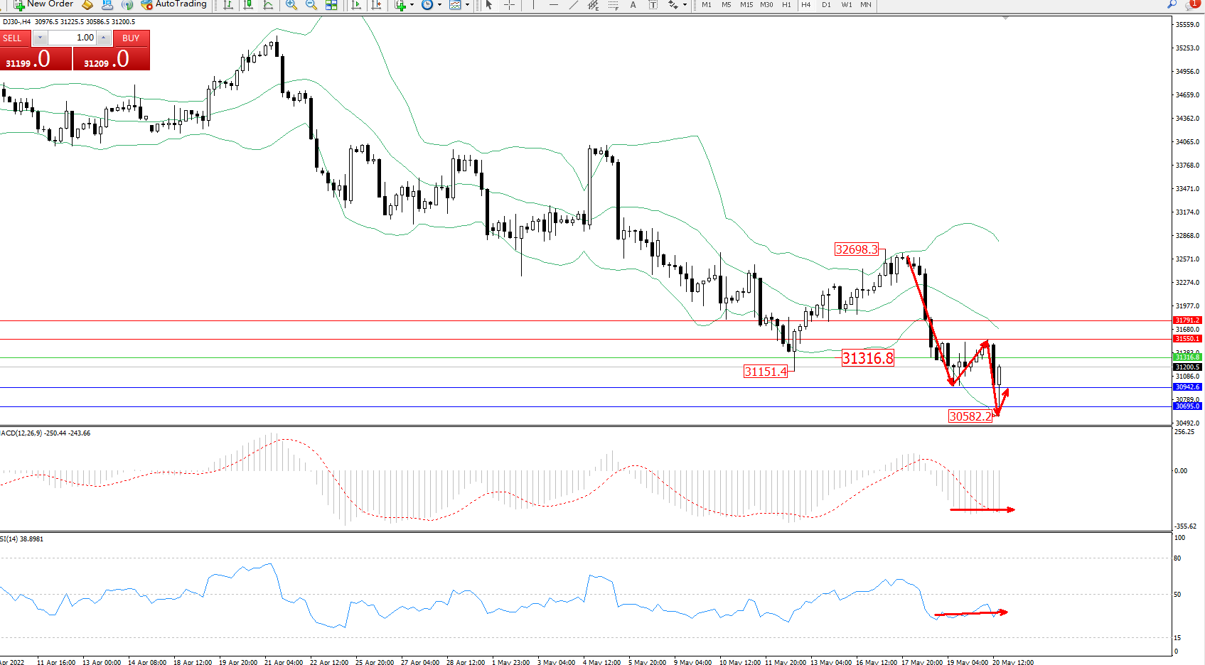 道琼斯指数DJ30——4小时K线图显示: