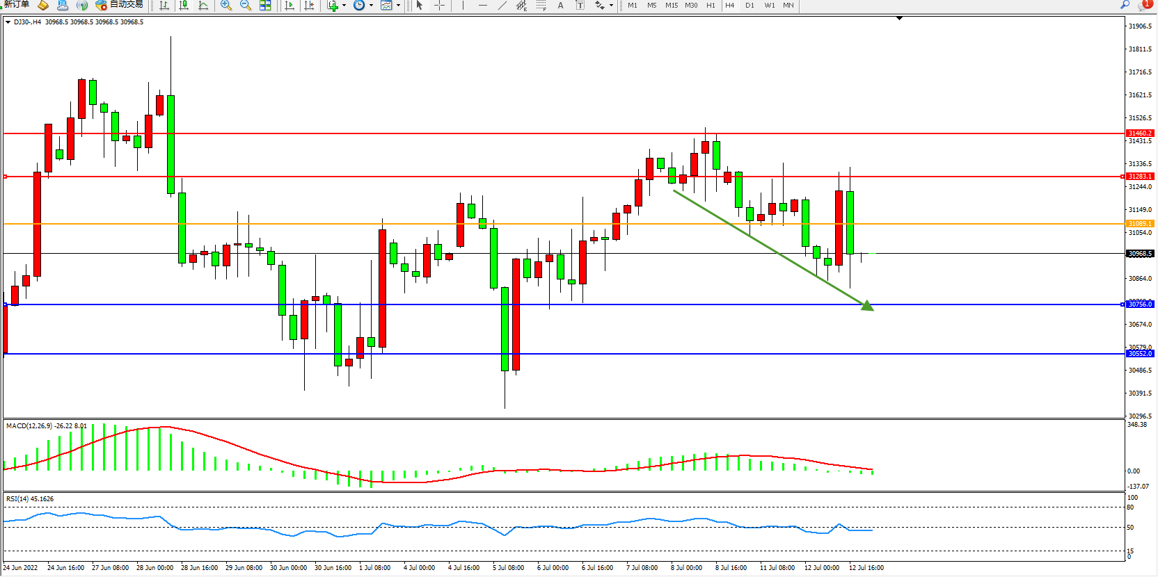 道琼斯指数DJ30——4小时K线图显示: