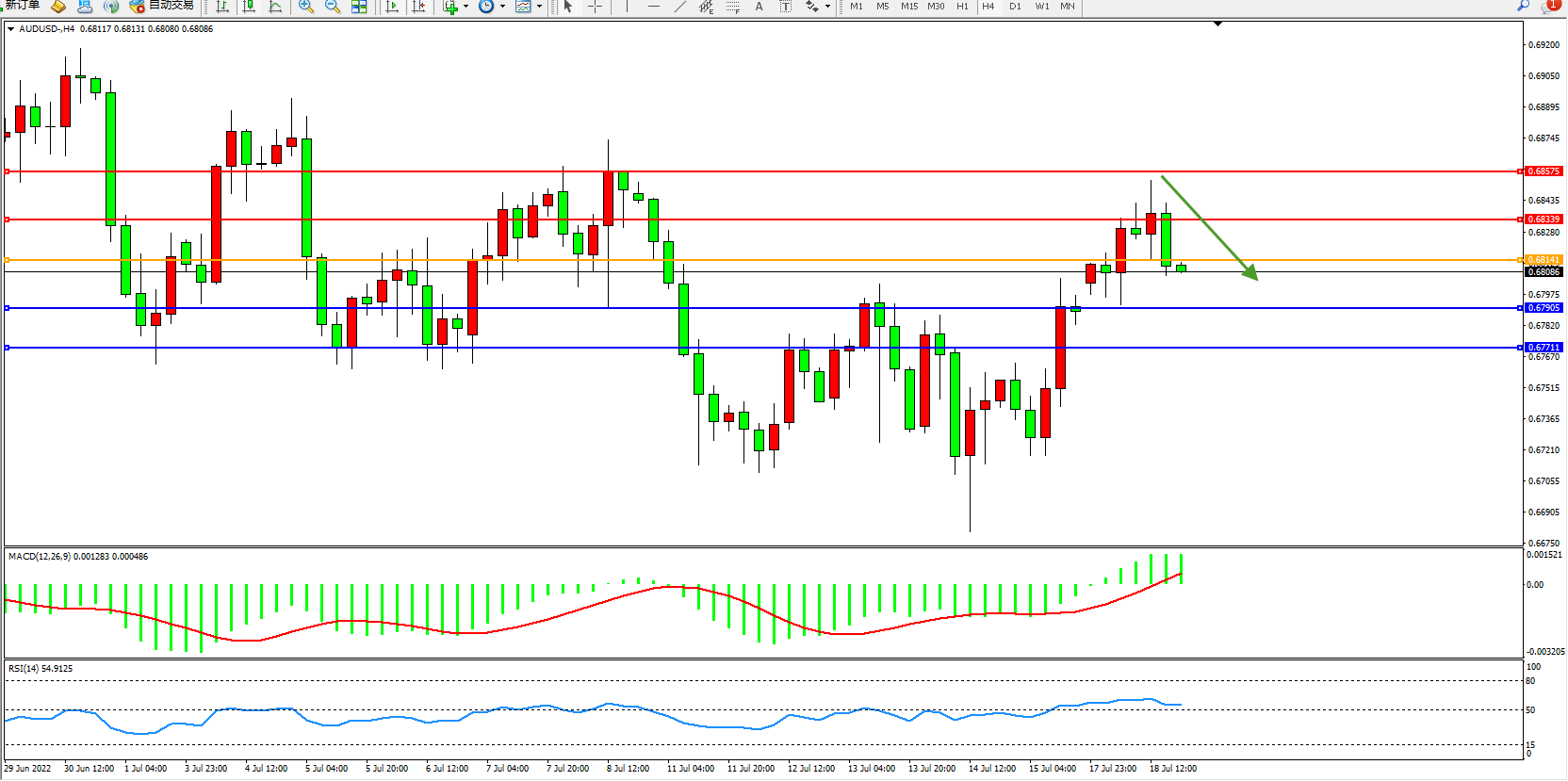 备选策略:0.68141上方看涨,目标0.68339、0.68575