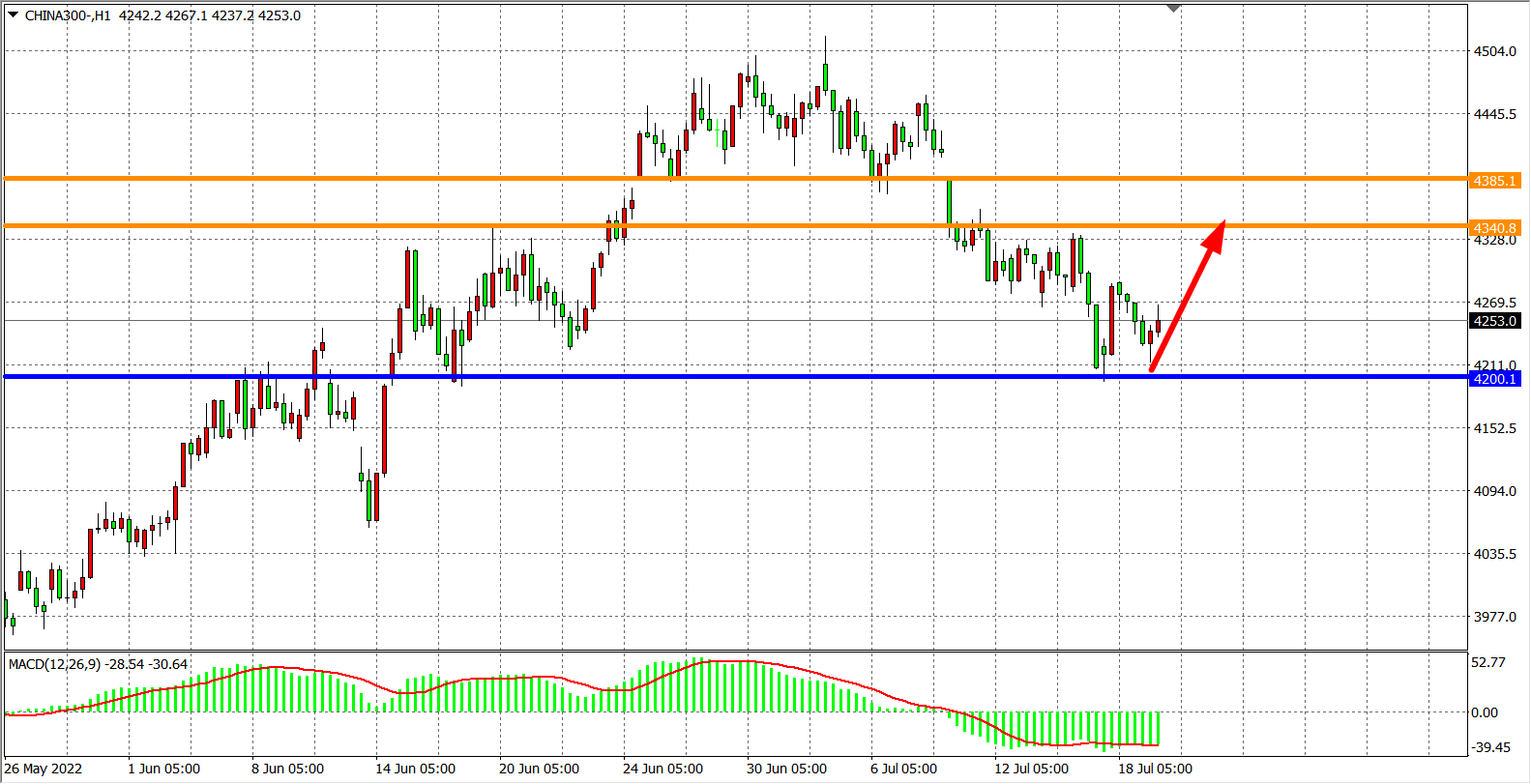 1小时图看,沪深300在4200之上获得止跌反弹,MACD于零轴之下开始缩量,预示行情有望展开反弹,日内在4200之上看反弹为主,目标4340-4385