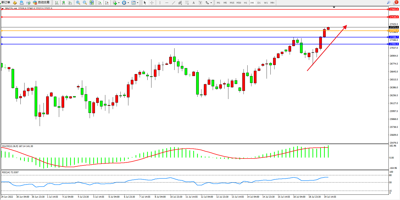 日经225指数7月19日(周二)收盘上涨164.03点,涨幅0.61%,报26952.50点。路透调查:日本2022财年GDP增长率预测降至1.9%,2023财年为1.6%(6月份调查的2.2%和1.6%)。2022财年日本核心CPI增长预测为2.1%,2023财年为1.1%(与6月份调查持平)。