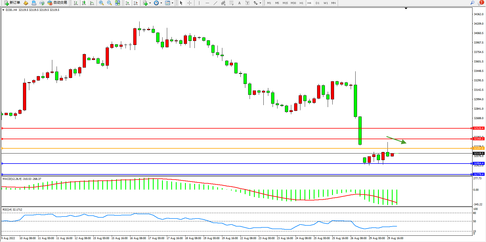 道琼斯指数DJ30——4小时K线图显示: