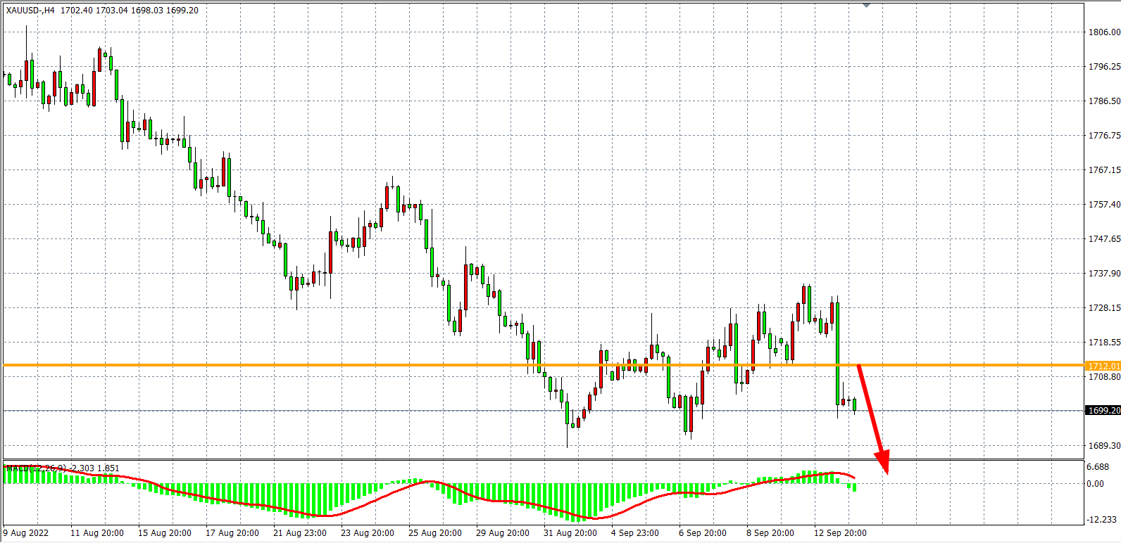 4小时图看,金价冲高回落强势回跌,连破关键支撑,MACD于零轴之下开始放量,显示趋势开始进入跌势,前期强支撑1712已转化为阻力,日内在该位之下延续看跌,下方目标1688-1675