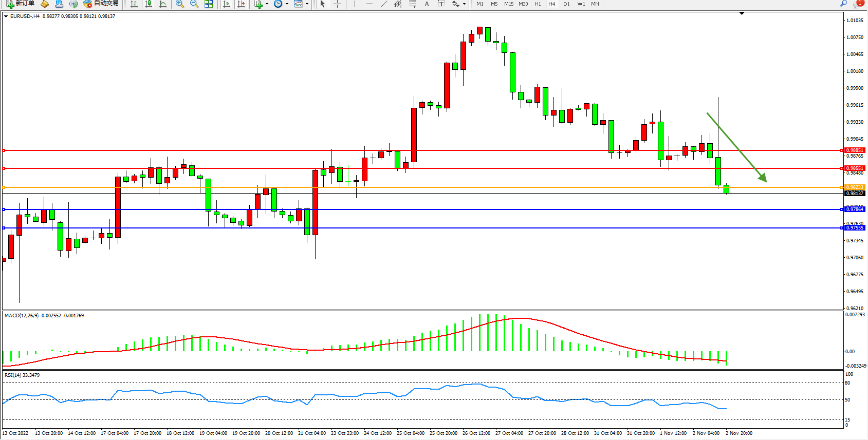 4小时图看:高位空头动力维持区间震荡持续下行,短期跌势未见止步,市场空头情绪态势良好,MACD指标处于0轴线下侧弱势下移,RSI指标处于50均衡线下侧弱势震荡;