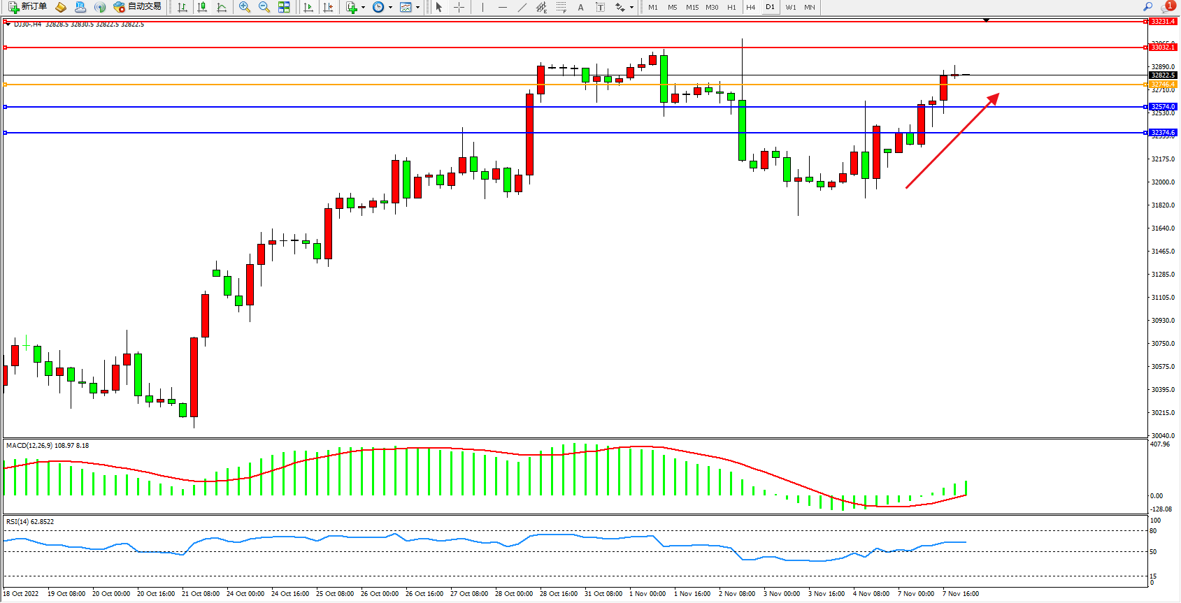 道琼斯指数DJ30——4小时K线图显示:
