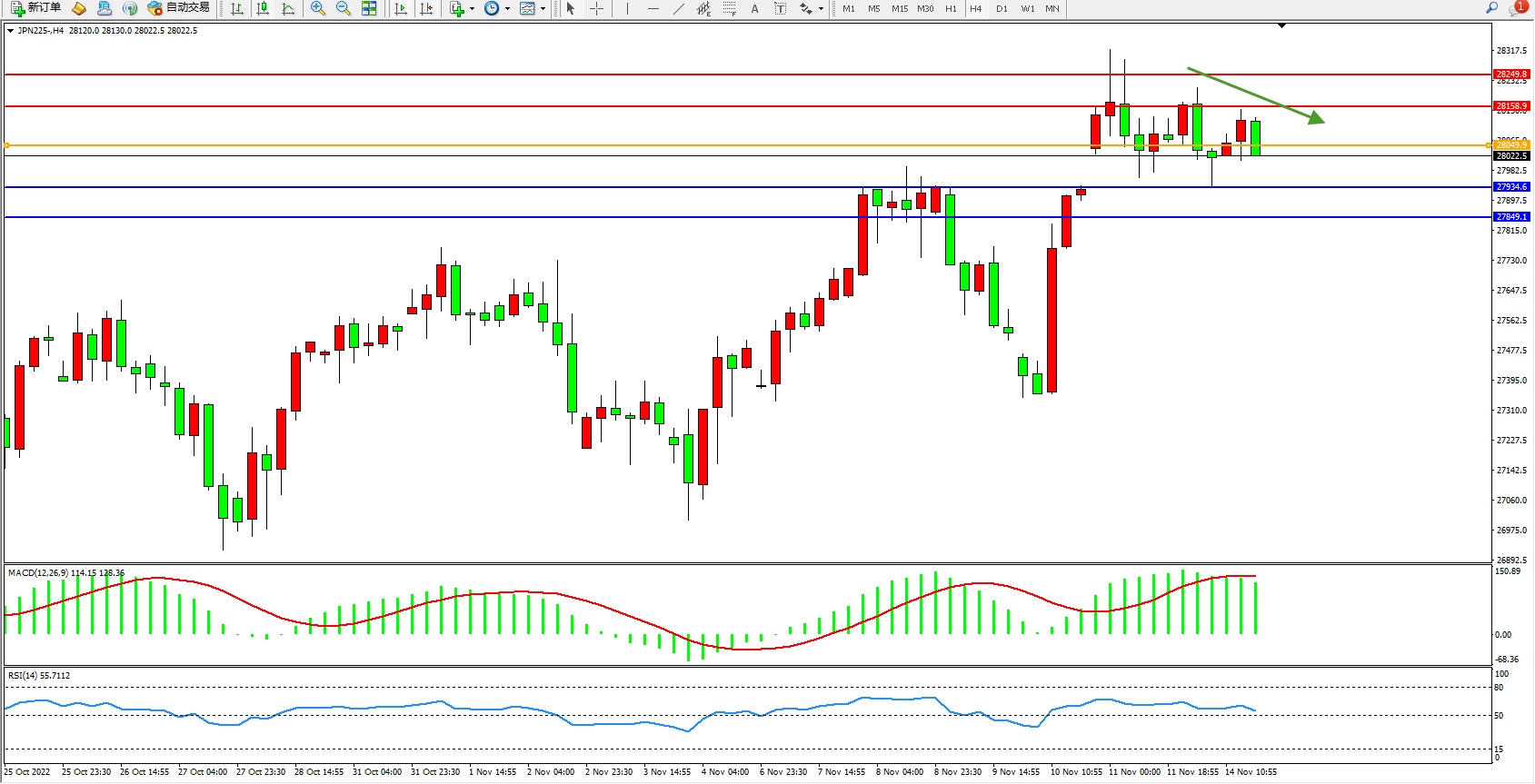 日经225指数11月14日(周一)收盘下跌298.57点,跌幅1.06%,报27965.00点。日本央行行长黑田东彦:需要关注日本经济的下行风险。密切关注原材料通胀、汇率变动对企业和家庭的影响。日本金融体系仍然具有弹性。