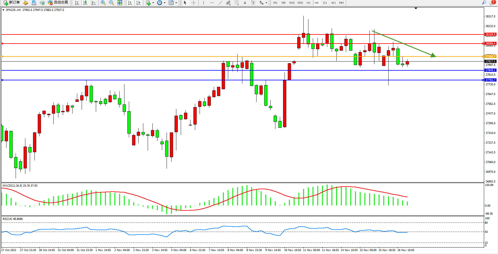 日经指数JPN225——4小时K线图显示: