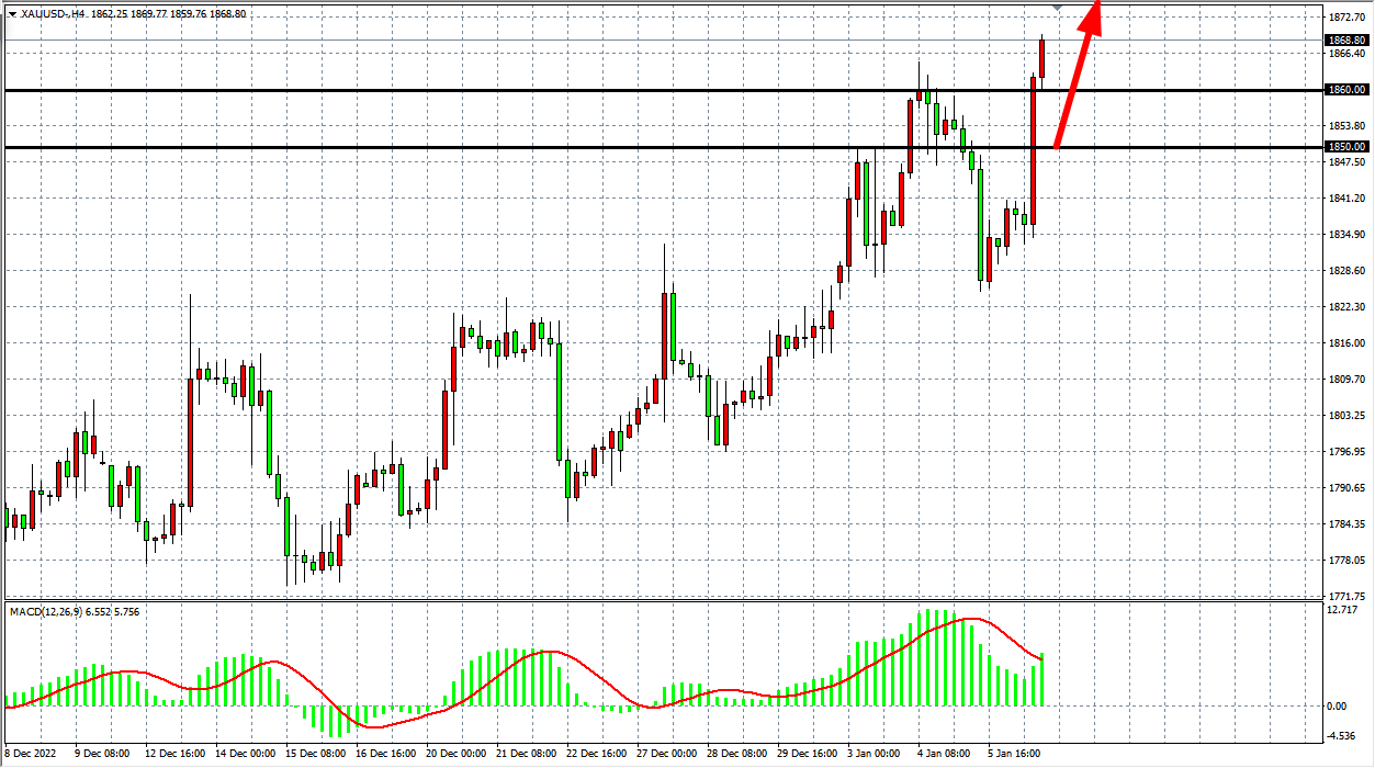 4小时图看,金价在1830支撑之上持续走强,且上涨破位前一波高点1860一线,MACD量能在零轴之上持续放量,显示行情重新回归强势多头走势,前高压力1860已转化为短支撑,而强支撑位于1850附近,日内在1850之上继续看涨,上方目标看1878-1900附近。