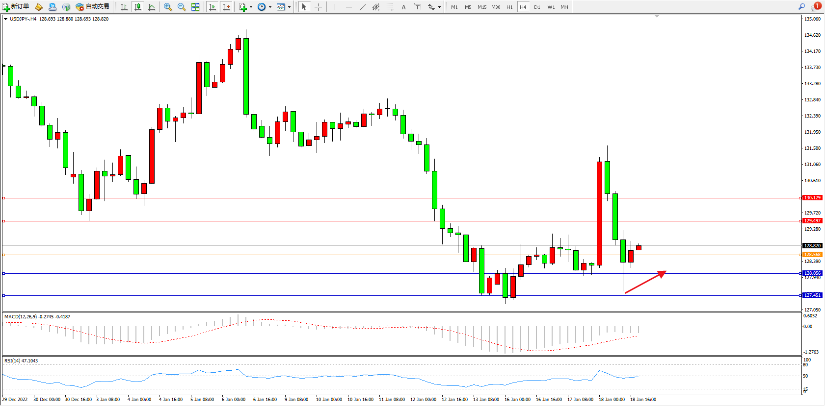 交易策略:128.568上方看涨,目标129.497、130.129