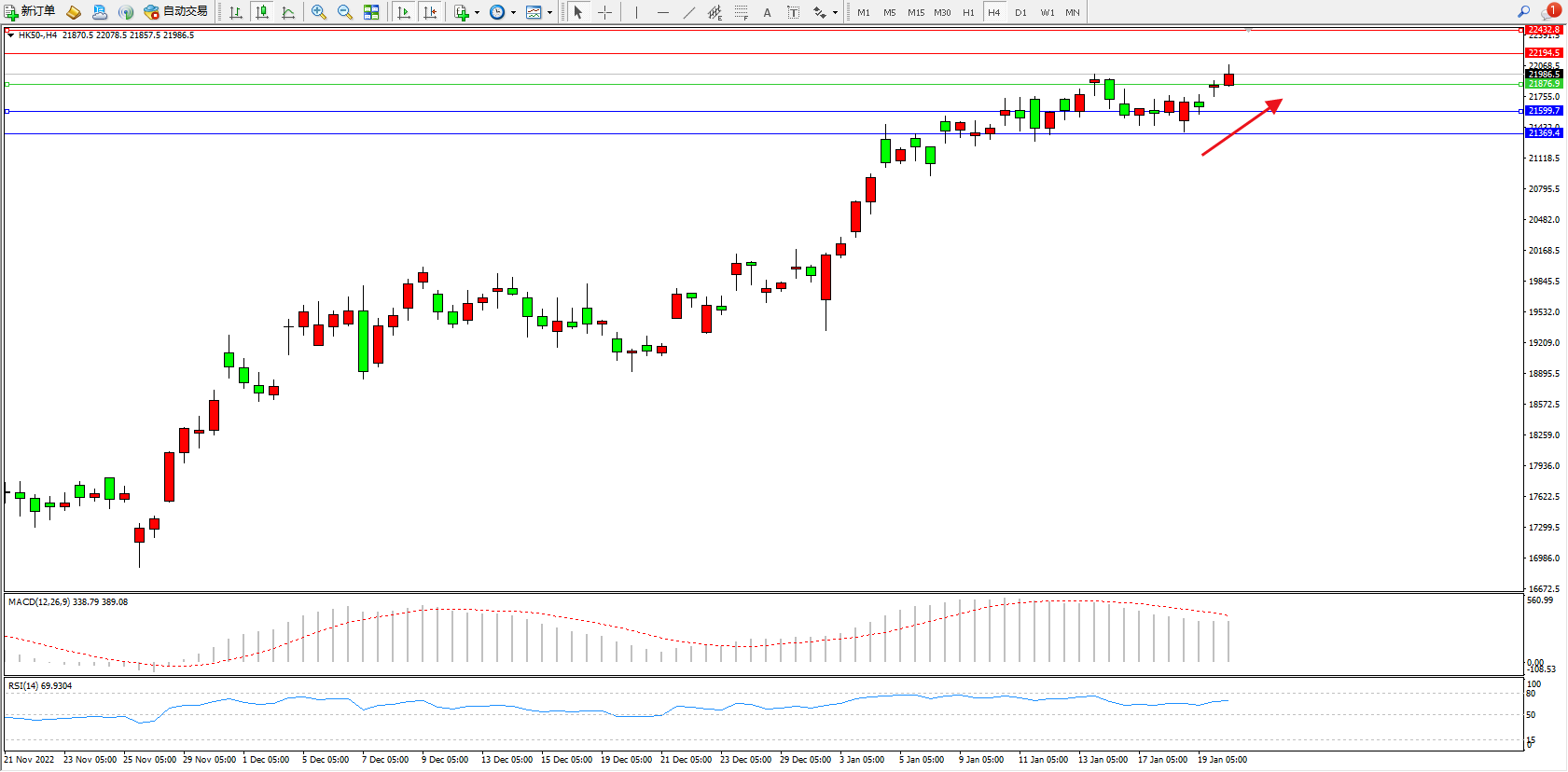香港恒生指数1月20日(周五)收盘上涨393.67点,涨幅1.82%,报22044.65点;虎年最后一个交易日,港股高开高走,三大指数集体收涨,恒指涨1.82%冲上22000点,创2022年7月5日新高;恒生科技指数涨2.67%,国指涨2.34%刷新去年7月中旬新高。大市成交额为951亿港元。大型科技股集体上涨,百度、美团涨约5%,阿里巴巴涨近4%,京东涨3%,腾讯、网易涨2%。春节各地酒店、饭店、景区人流量和预订量回升,香港特区政府社会福利署(社署)今日公布,自今年2月1日起,将调高综合社会保障援助标准项目金额,以及公共福利金计划下的高龄津贴与老年人生活津贴(包括“广东计划”及“福建计划”下的高龄津贴与老年人生活津贴)和伤残津贴金额。