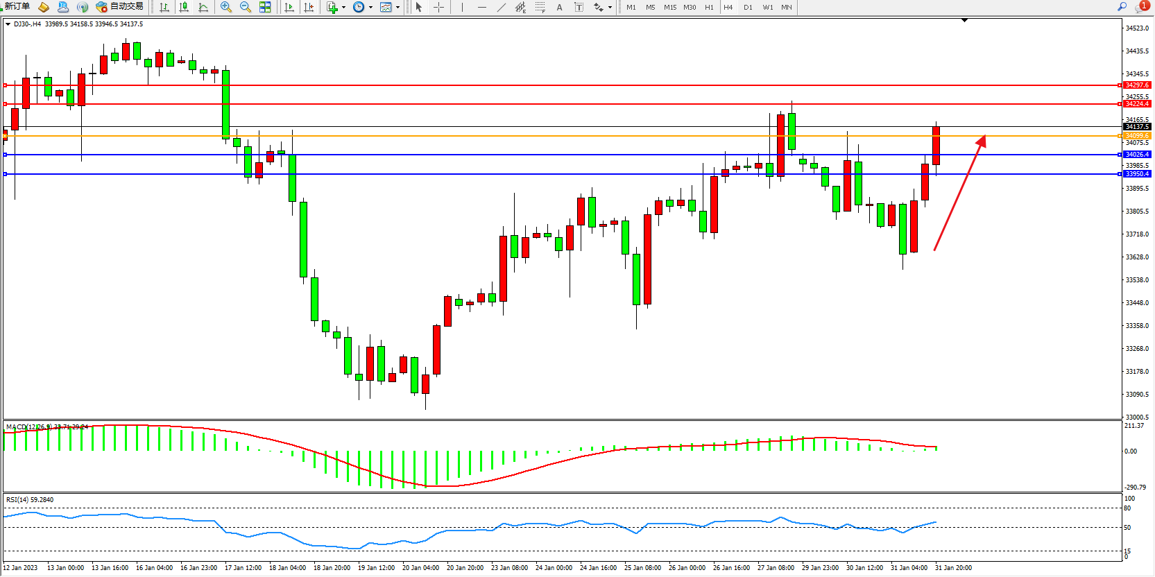 道琼斯指数DJ30——4小时K线图显示: