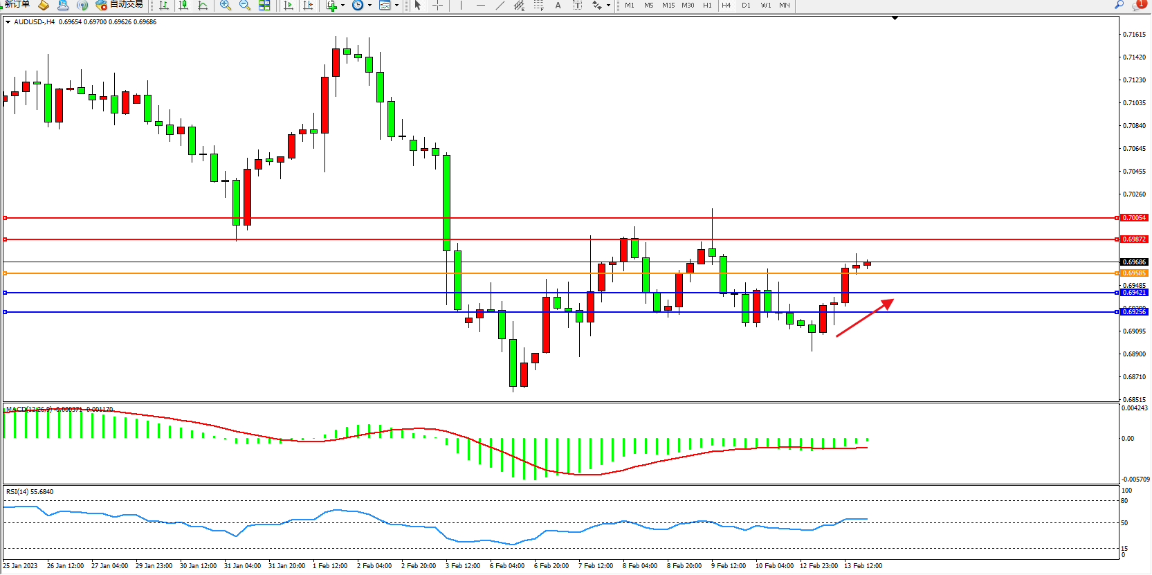交易策略:0.69585上方看涨,目标0.69872、0.70054