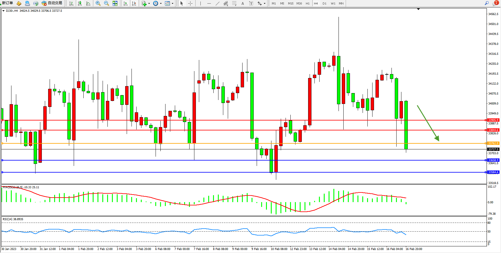 交易策略:33762下方看跌,目标33658、33584