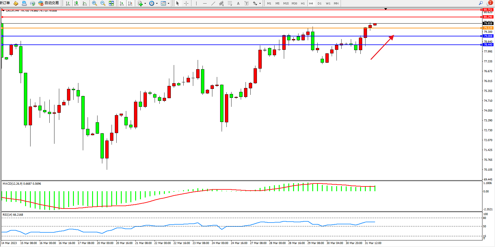 布油维持79.858附近震荡,布伦特原油在3月20日跌至近70美元后,已回升近7美元,原因是人们对全球银行业危机的担忧有所缓解,而且伊拉克库尔德斯坦地区的出口停止也抑制了供应。