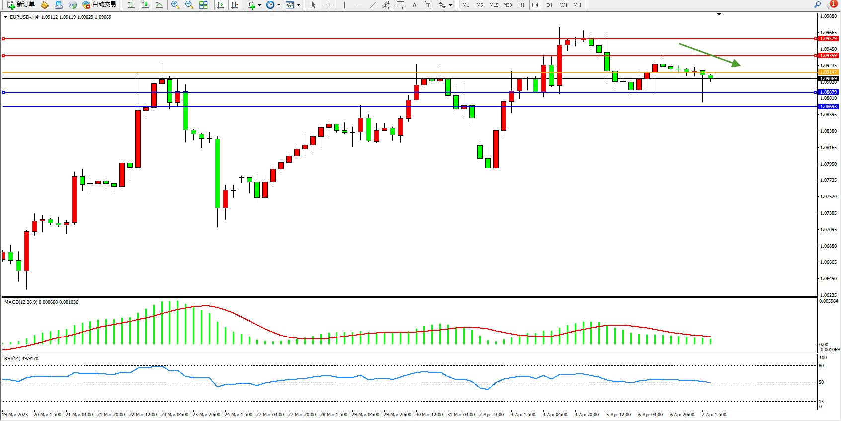 欧元美元EURUSD—4小时K线图显示: