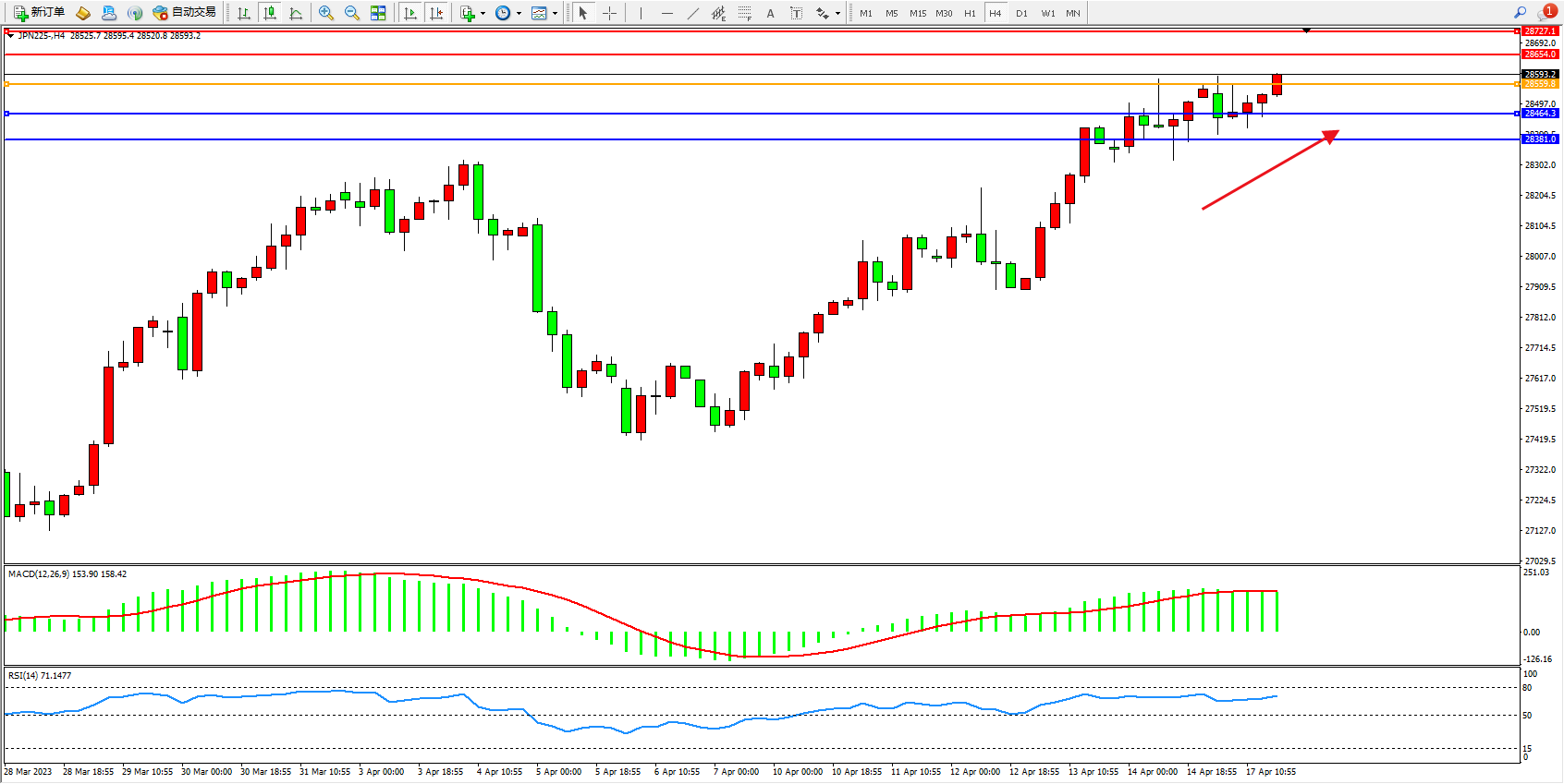日经指数JPN225——4小时K线图显示: