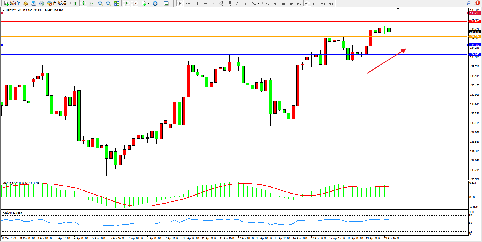 交易策略:134.554上方看涨,目标134.972 135.213