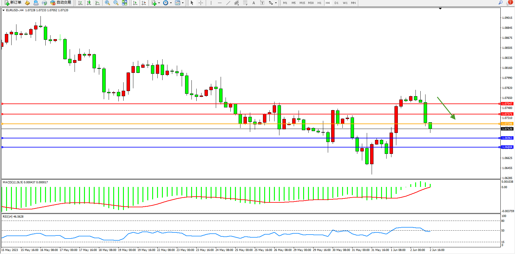 欧元美元EURUSD—4小时K线图显示: