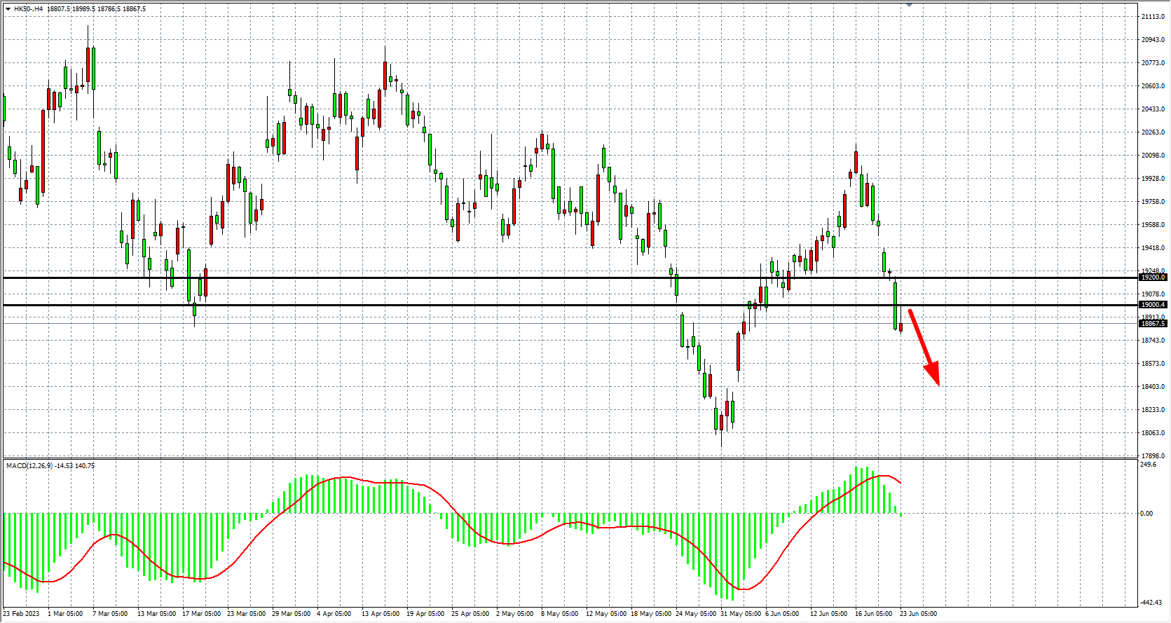 周五(6月23日)恒生指数连续第四个交易日低开,收于19000关口下方