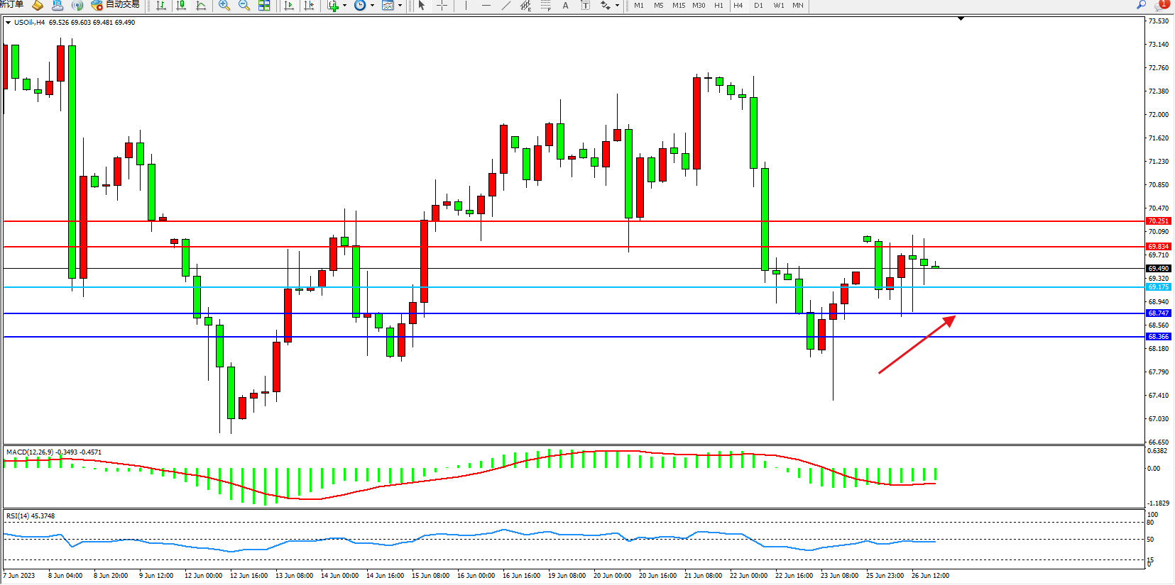 交易策略:69.175上方看涨,目标69.834  70.251